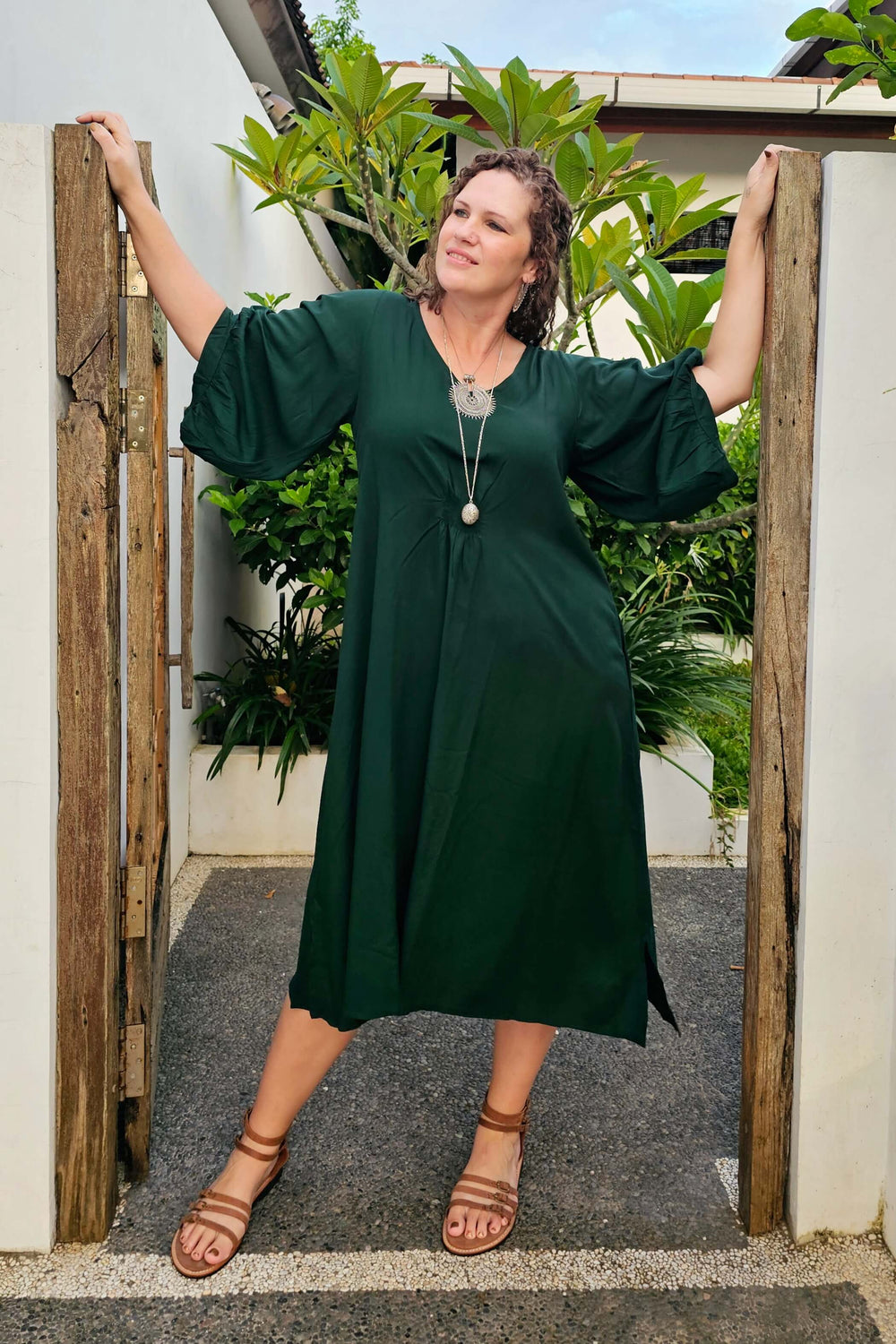 This is one of those dresses that just gets your body. With a flattering shirred waistband (front and back), bold floaty sleeves, and a non-clingy, curve-skimming fit, it’s made to celebrate your shape—without sacrificing comfort.