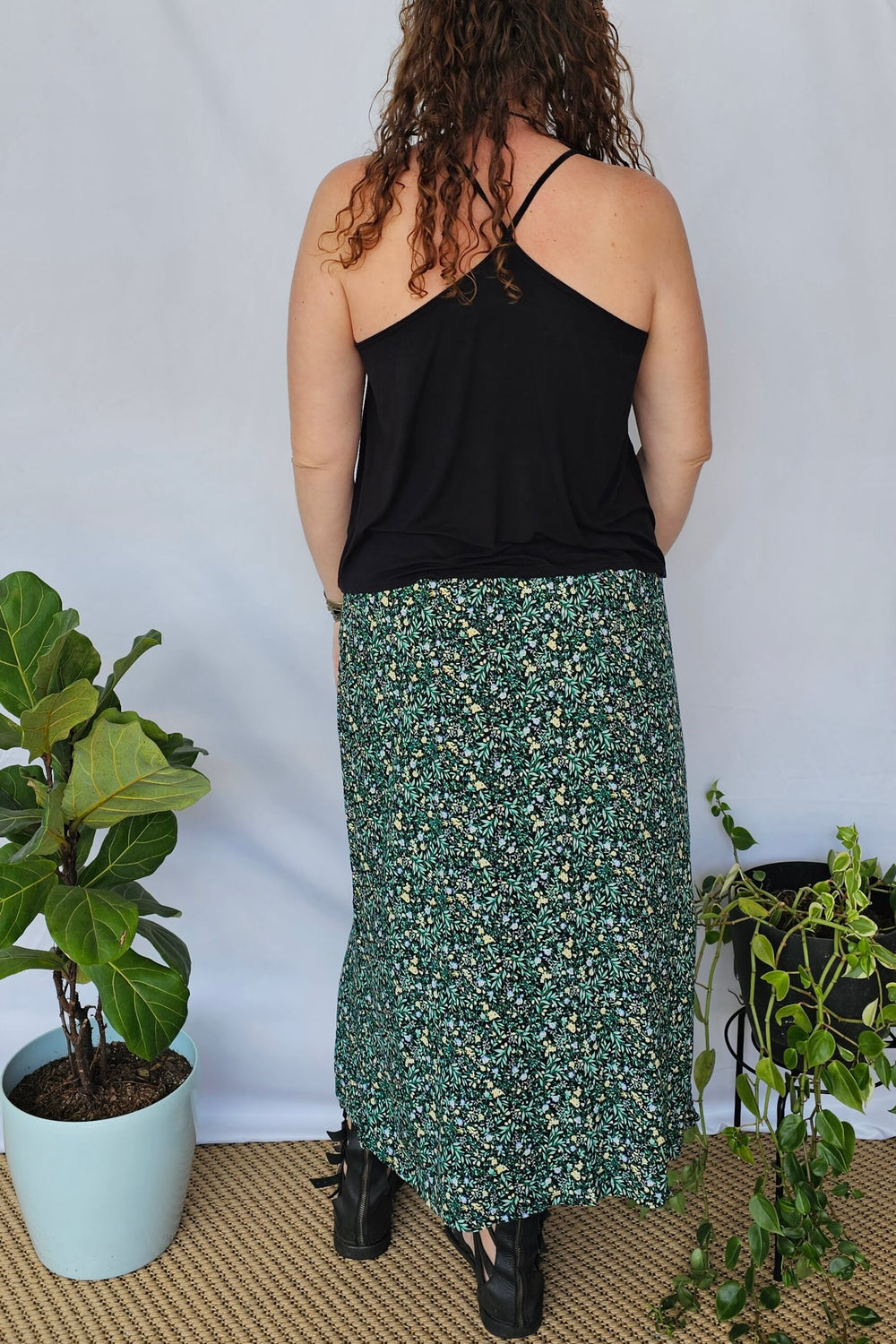 The Green Blossom Maxi Skirt is the perfect mix of comfort and style. With a soft cotton jersey waistband and a flowy rayon body, it skims beautifully while giving you a secure, flexible fit. The straight-line cut is designed with hidden ease through the hip seam so you get movement without bulk. Adjustable hem ties let you change up the length to suit your mood, and the black-and-green floral batik print makes it a versatile statement piece.