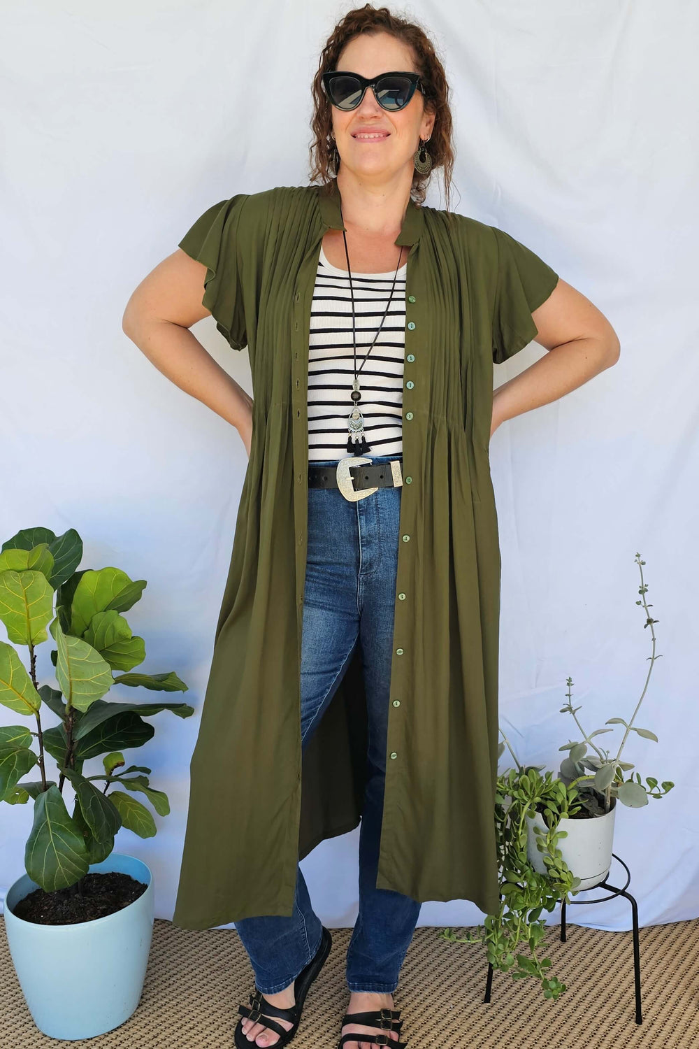 The Khaki Frill Sleeve Maxi Dress has all the right moves—soft frill sleeves, full button-through front, a little extra shaping at the back, and of course, plenty of room in the hips and tummy for that comfy, confident fit you love.