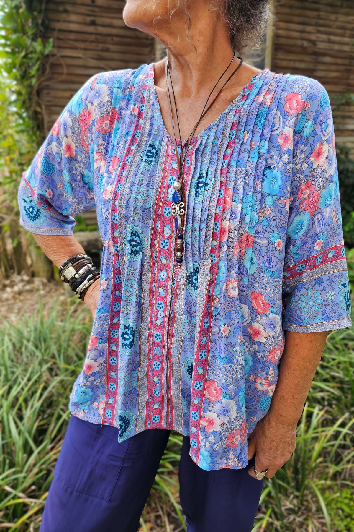 Featuring a gentle V-neckline, functional front buttons, and soft tube-style sleeves, this longer-line top gives you a little extra coverage and movement- perfect for layering or wearing loose with your favourite pants.