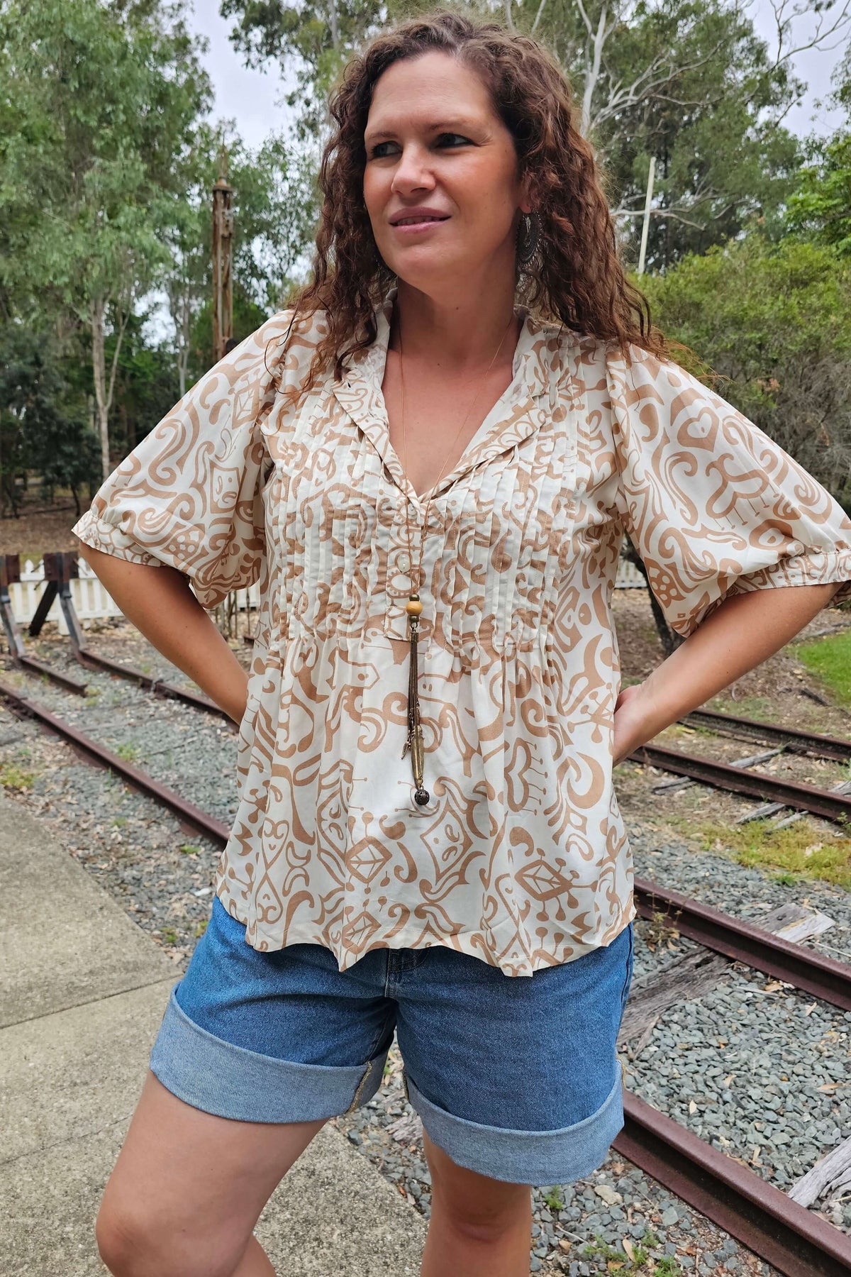 The bell sleeves create flow and coverage without adding bulk, while the relaxed body skims gently over you without clinging anywhere. Pintuck detailing through the front adds subtle structure so it feels considered, not oversized, and the premium rayon drapes lightly for that cool, breathable feel against the skin.