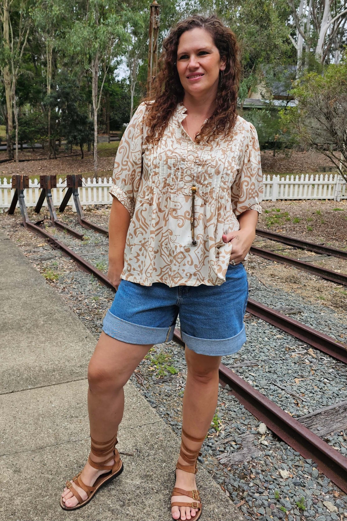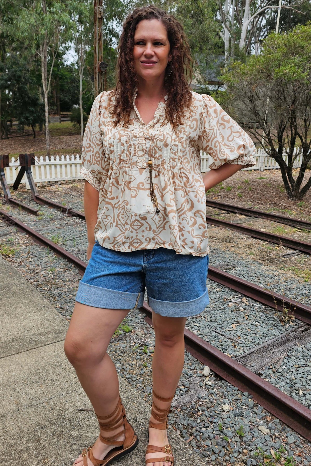 The taupe swirl print is soft, flattering and endlessly easy to pair back with denim, linen or wide-leg pants.