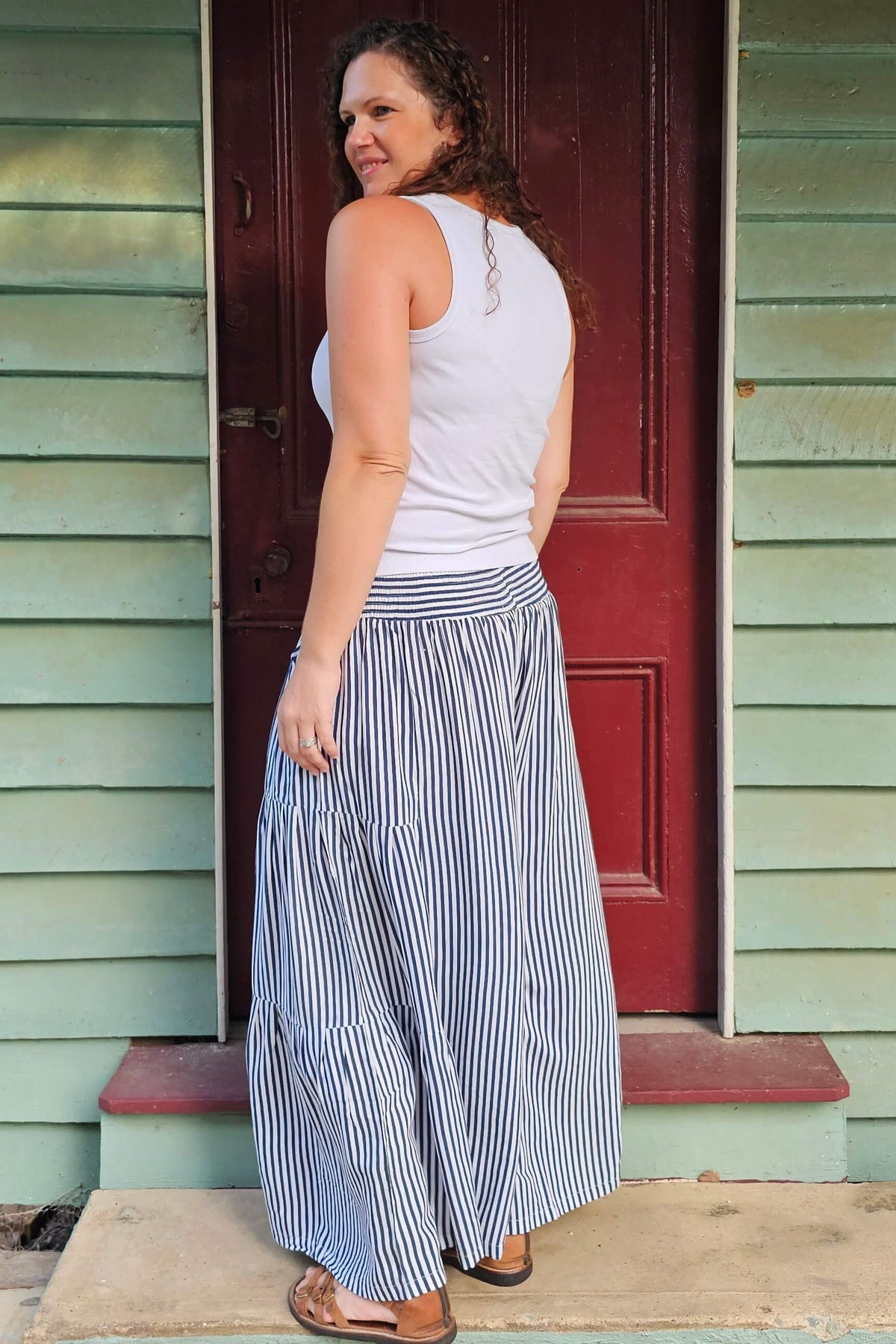 The shirred waistband stretches and smooths without digging in. The wide leg creates beautiful movement as you walk. And the soft frill running down the outer leg adds a subtle, feminine detail that turns a simple stripe into something special.