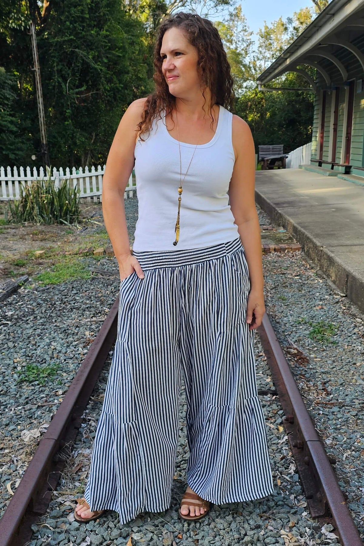 The Navy Stripe Frill Pants are made for the days you want to feel comfortable, confident, and completely unrestricted- without looking like you chose comfort first.