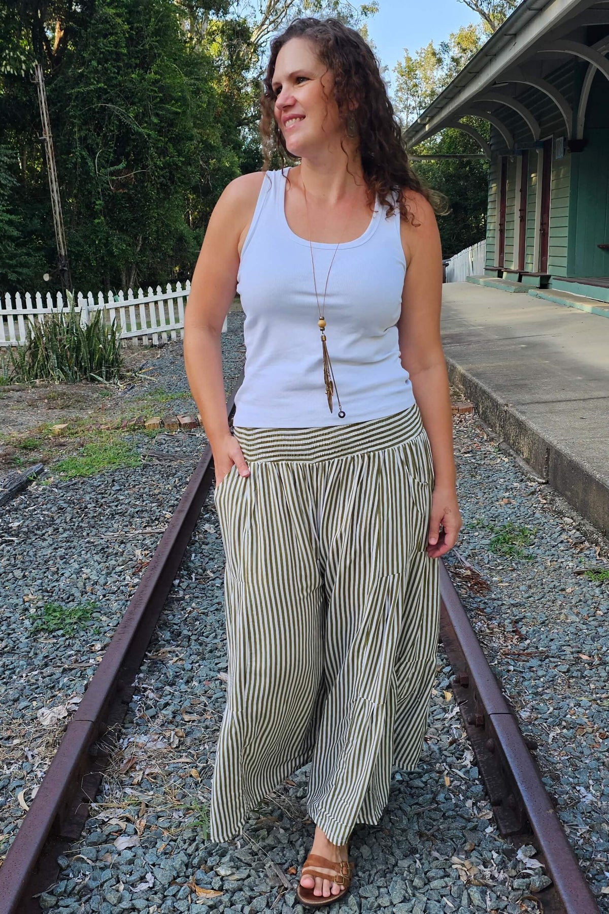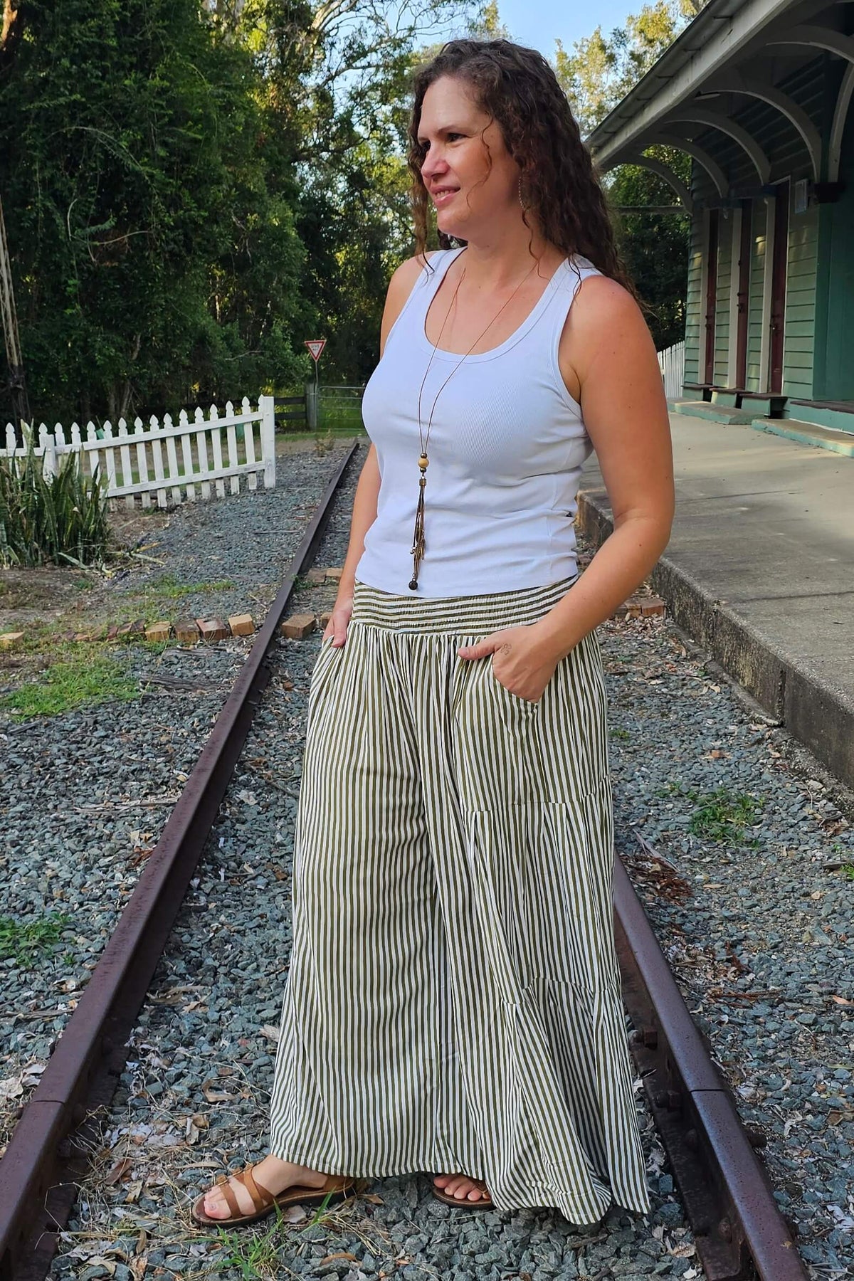 That soft shirred waistband? It stretches with you, not against you. The wide swishy leg? Pure freedom. And the frill running down the sides? Just enough drama to make a stripe feel fun instead of sensible.