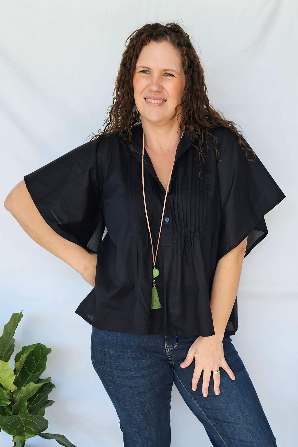 With a relaxed fit, feminine drape sleeves, and a classic navy tone, this top slips easily into your everyday rotation. Whether tucked into jeans or layered under a blazer, she’s easygoing but elevated.